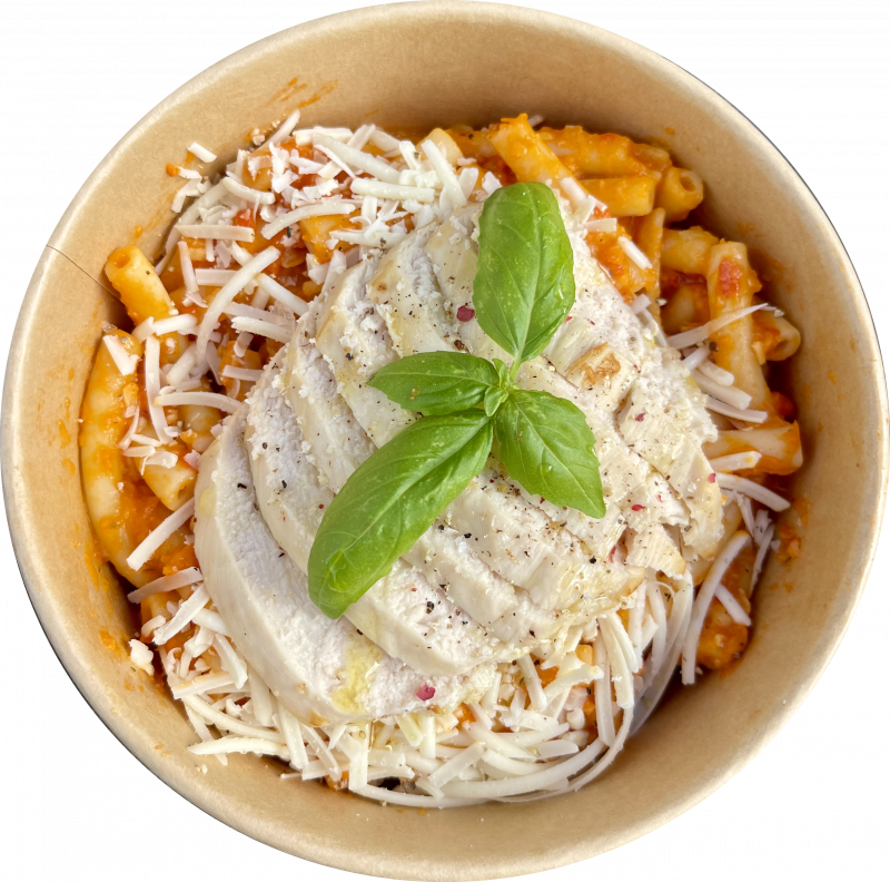 Těstoviny, kuřecí prsíčka, paprika, okurek, červená cibule, dresink (slunečnicový olej, voda, zakysaná smetana, ocet, cukr, rajčatový protlak, červená paprika, pasterizovaný vaječný žloutek, jedná sůl, hořčice, kukuřičný škrob, ivertní cukr, pažitka, pepř).